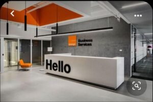 A branded reception and welcome area crafted for Orange, featuring refined décor and a modern aesthetic.